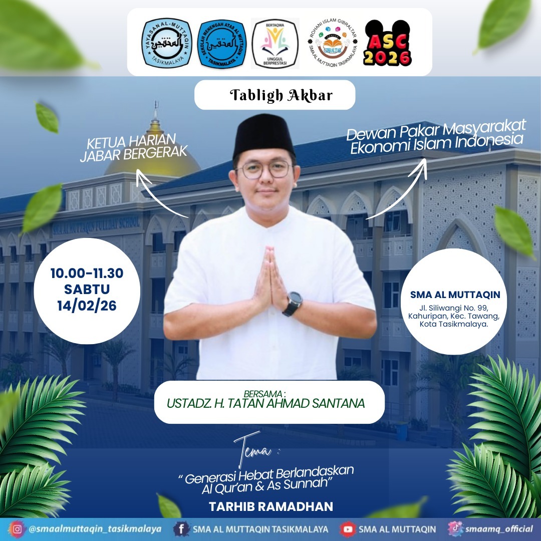 SMA Al Muttaqin Tasikmalaya Dalam upaya membentuk karakter siswa yang kokoh berlandaskan nilai-nilai Islam, dengan bangga akan menyelenggarakan acara Tabligh Akbar yang insyaAllah akan dihadiri oleh penceramah ternama, Ustadz H. Tatan Ahmad Santana.
