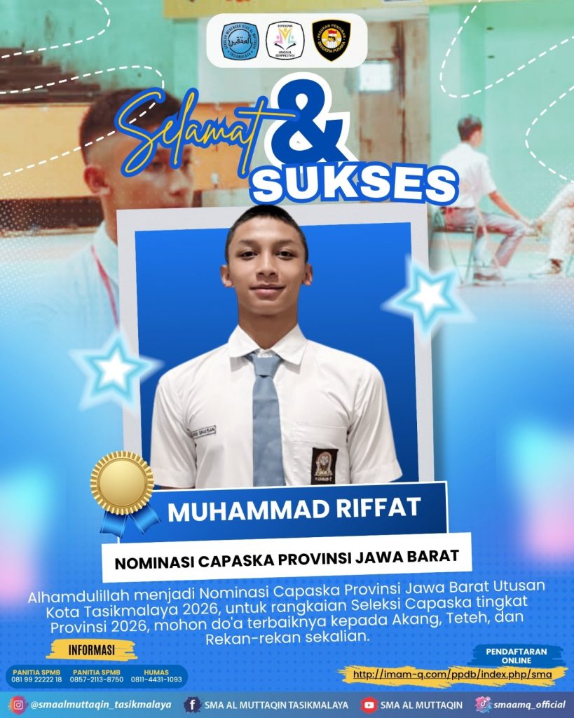 Selamat & Sukses ananda Riffat admintu 3 Selamat & Sukses! 🌟Alhamdulillah, ananda Muhammad Riffat kelas 10.4 berhasil menjadi Nominasi Capaska Provinsi Jawa Barat mewakili Kota Tasikmalaya 2026! 💪✨